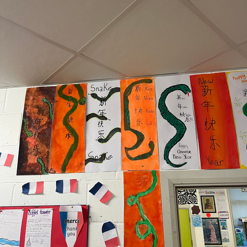 The Chinese New Year began on Wednesday 29th of January. To mark the occasion, we learned about how the event is celebrated in China and the animals associated with each year. 2025 is the year of the Snake. We learned how to say Happy New Year in Chinese and decorated banners with Happy New Year written in Chinese characters and snakes!